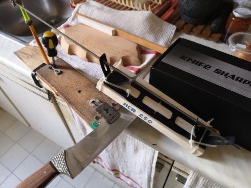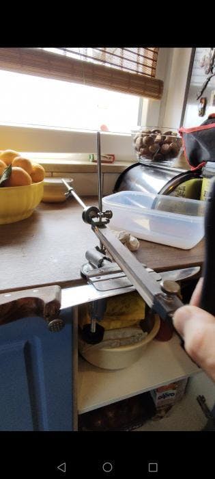 Montează ascuțitorul de un blat.Ajustează unghiul pentru ascuțire.Ascute lama în funcție de nevoile tale.