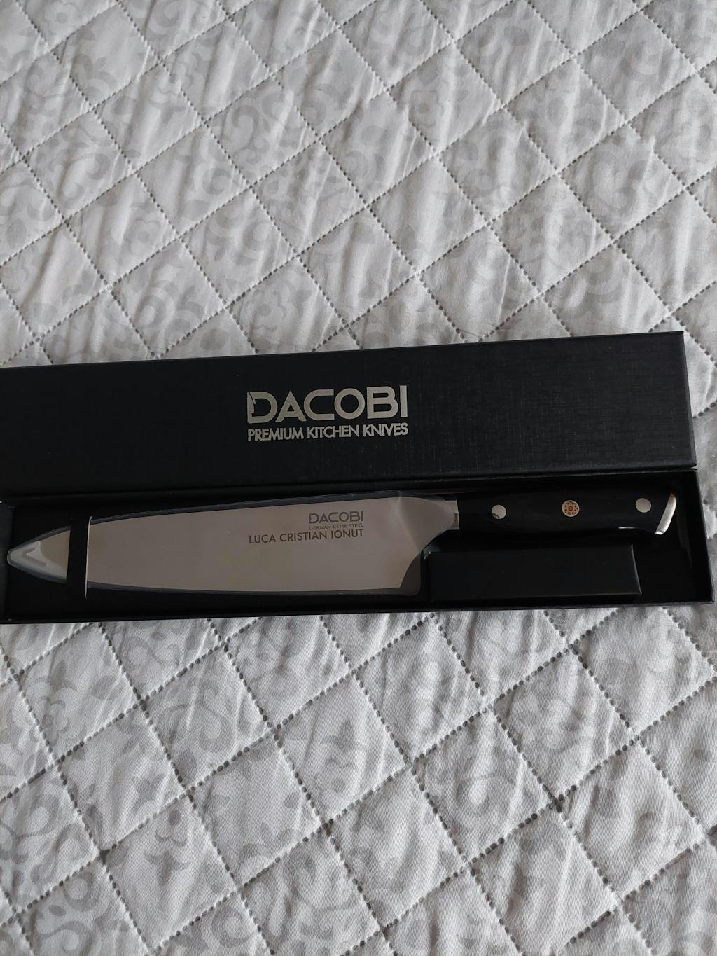 Pachetul conține: cutie de protecție din carton negru premium, 1x Cuțitul bucatarului oțel german 20.5 cm (C6).