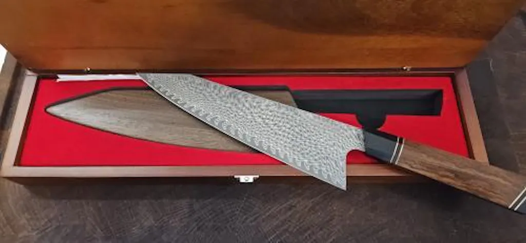 Pachetul conține: 1x Cuțit profesional Kiritsuke, oțel damasc, mâner desert ironwood, 21.5 cm (C54), 1x Teacă din lemn magnetică, 1x Cutie premium de lemn.