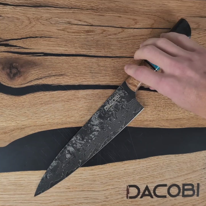 Lama și mânerul ergonomic sunt perfecte pentru folosirea cuțitului în restaurant de către cunoscători dar și pentru bucătarii amatori care se pregătesc să treacă la nivelul următor. Iar calitățile trec dincolo de practicabilitate. Am combinat oțelul de damasc în 67 straturi, vestit pentru duritate, cu un lemn la fel de vestit, utilizat și la mânere de scule profesionale: lemnul solidificat și rășina turcoaz, perfect pentru mânerul ergonomic, fin și detaliat.