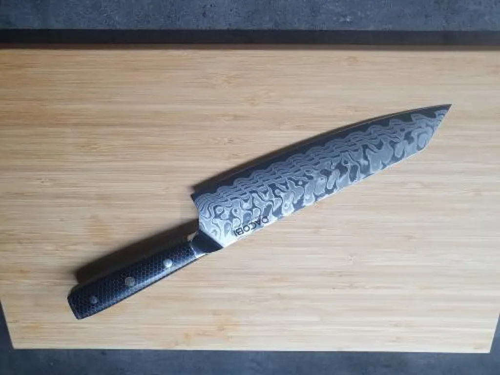 Încununarea setului nostru de cuțite de damasc cu mâner de rășină, acest cuțit al bucătarului, model japonez, este expresia vizuală a bucătarului modern. Completează cuțitele bucătarului, de filetat și pentru legume cu aceeași estetică impecabilă oferită de Dacobi. Aceste cuțite pot deveni chiar piese declarative, pentru că pot fi recunoscute cu ușurință după lama dreaptă cu vârful unei săbii, la fel ca ceva ce ai vedea într-un film antic cu samurai din epoca feudală a Japoniei.