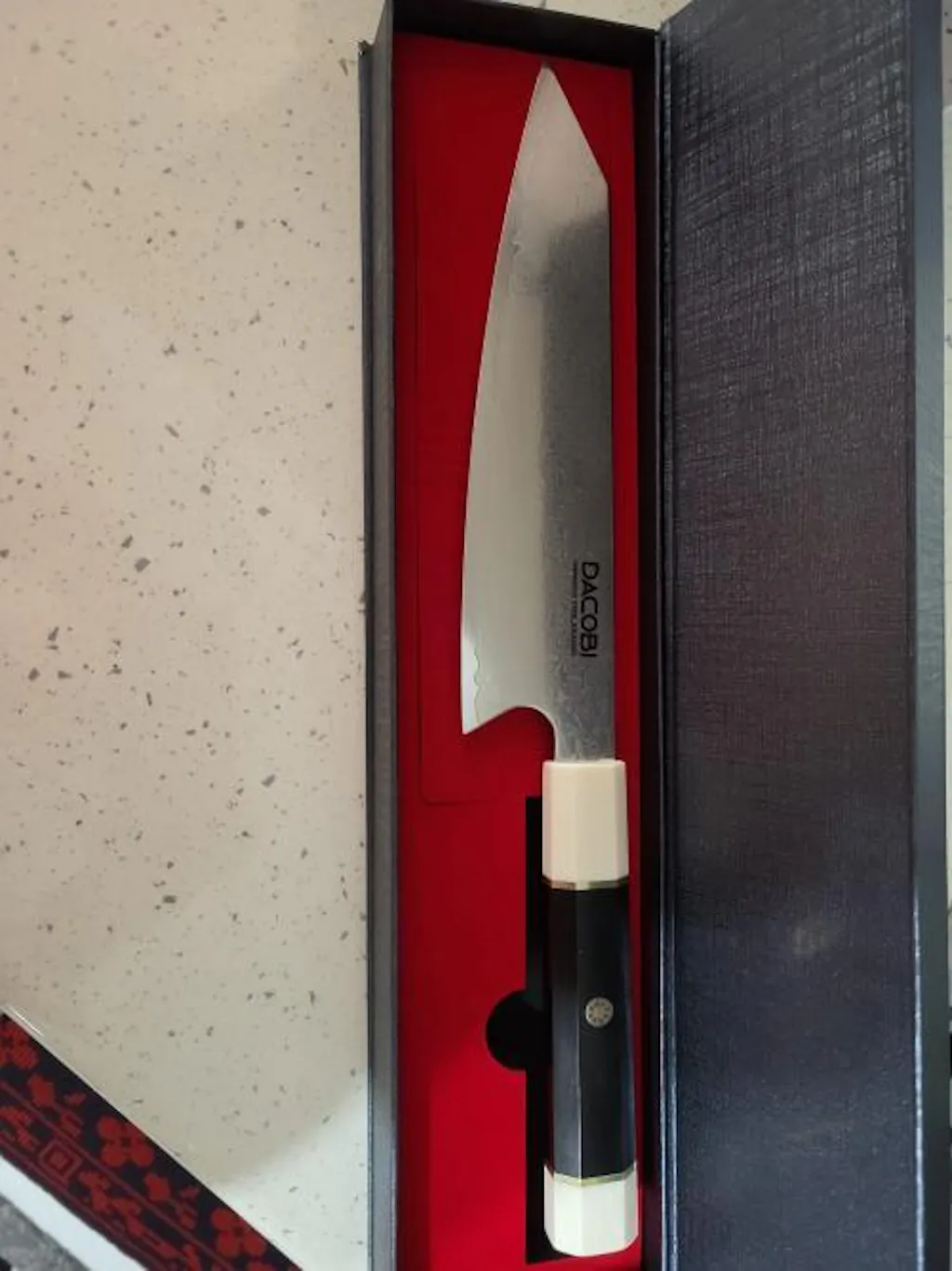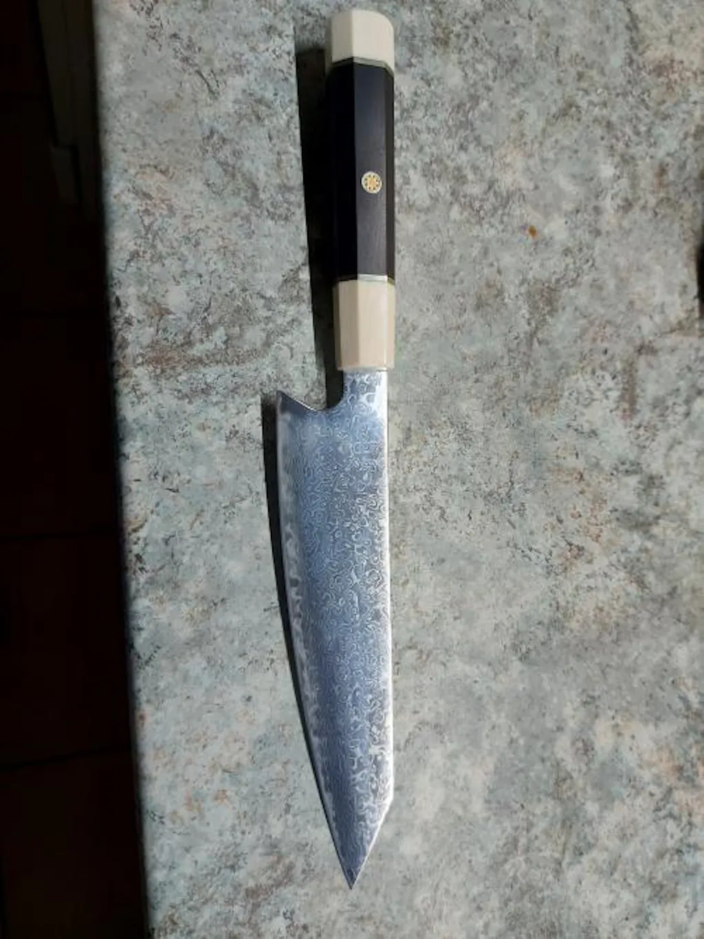 Am adus în shop pentru pasionați expresia completă a meșteșugului maeștrilor japonezi. Realizat din oțel de damasc cu un model ondulat, așa numit și oțel udat persan, acest cuțit profesional are și un mâner specific japonez, numit octogonal. Din lemn de trandafir, pentru frumusețe și rezistență, reprezintă întruchiparea cuțitului clasic realizat de o cultură care se definește prin precizie și estetică impecabilă. Este cuțitul potrivit pentru cunoscători și amatori de bucătărie și frumos.