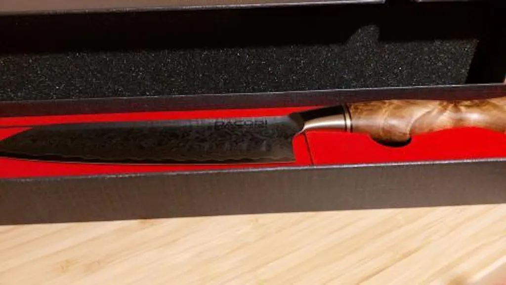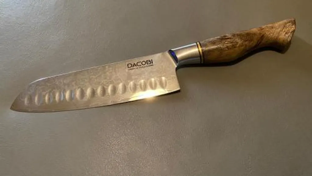 Precizia trece la un nivel superior, cu o combinație între oțelul Damasc binecunoscut pentru tăierea superioară, mânerul nobil de lemn Sycamore, ergonomic și forma unui Santoku realizat pentru cele "trei lucruri bune" din cultura japoneză a gătitului: mărunțire, tocare și feliere. Lungimea lamei este special creată pentru realizarea de felii netede, continue și lungi.