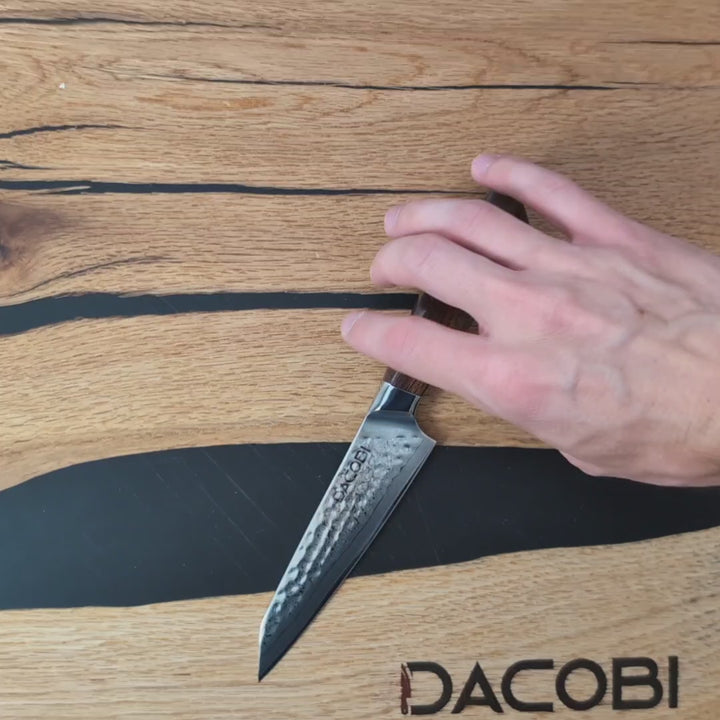 Vă prezentăm primul produs din gama premium din oțel japonez powder steel care cucerește orice bucătar cunoscător. Este apogeul dezvoltării, prin alăturarea la acest material și a unui tip de mâner din lemn la fel de nobil: american desert ironwood. Componente premium, pentru o experiență finală premium și bucătari urmăriți cu invidie.